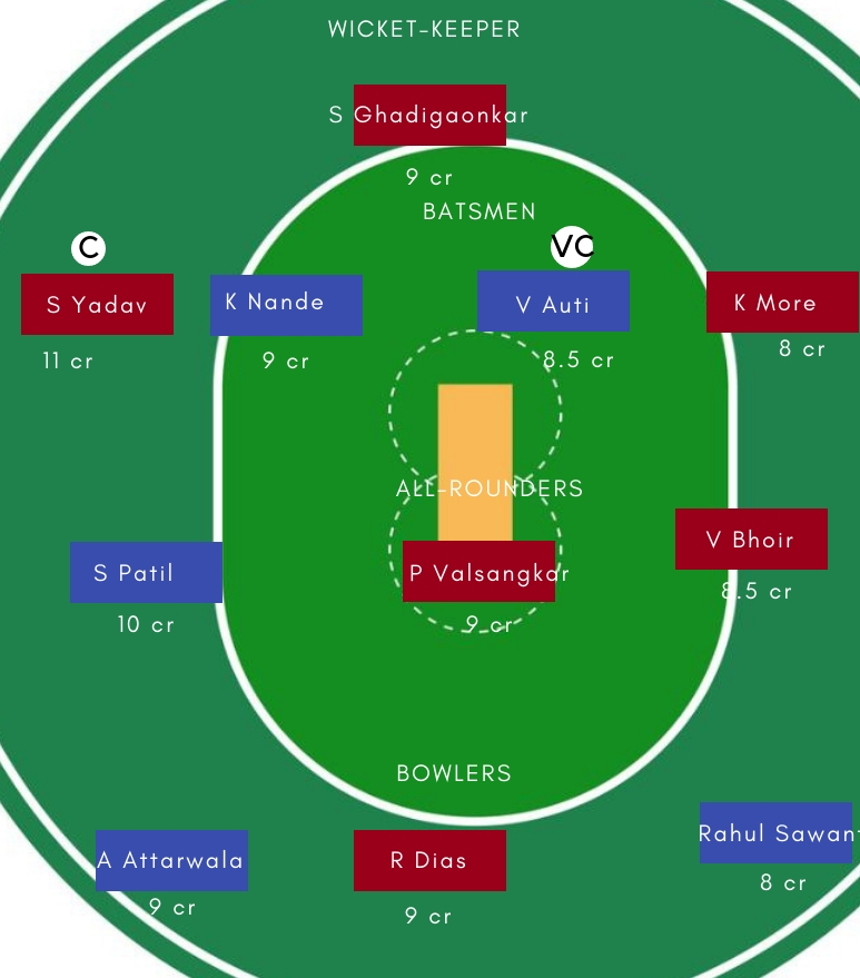 टीम के बल्लेबाजों ने बढिया प्रदर्शन करते हुए 169 रनों का सम्मानजक स्कोर खड़ा किया था। लेकिन टीम के गेदबाज इस लक्ष्य का बचाव करने में नाकाम रहे थे। कप्तान Vikrant Auti ने 37 गेंदों में 52 रनों की पारी खेली थी। जबकि Vishal Dhagonkar ने तूफानी बल्लेबाजी करते हुए 26 गेंदों में 46 रन बनाए थे। गेंदबाजी में Rahul Sawant ने 22 रन देकर 2 विकेट अपने नाम किए थे।