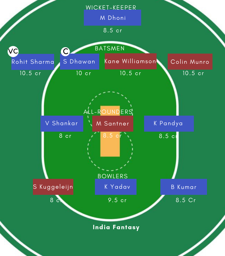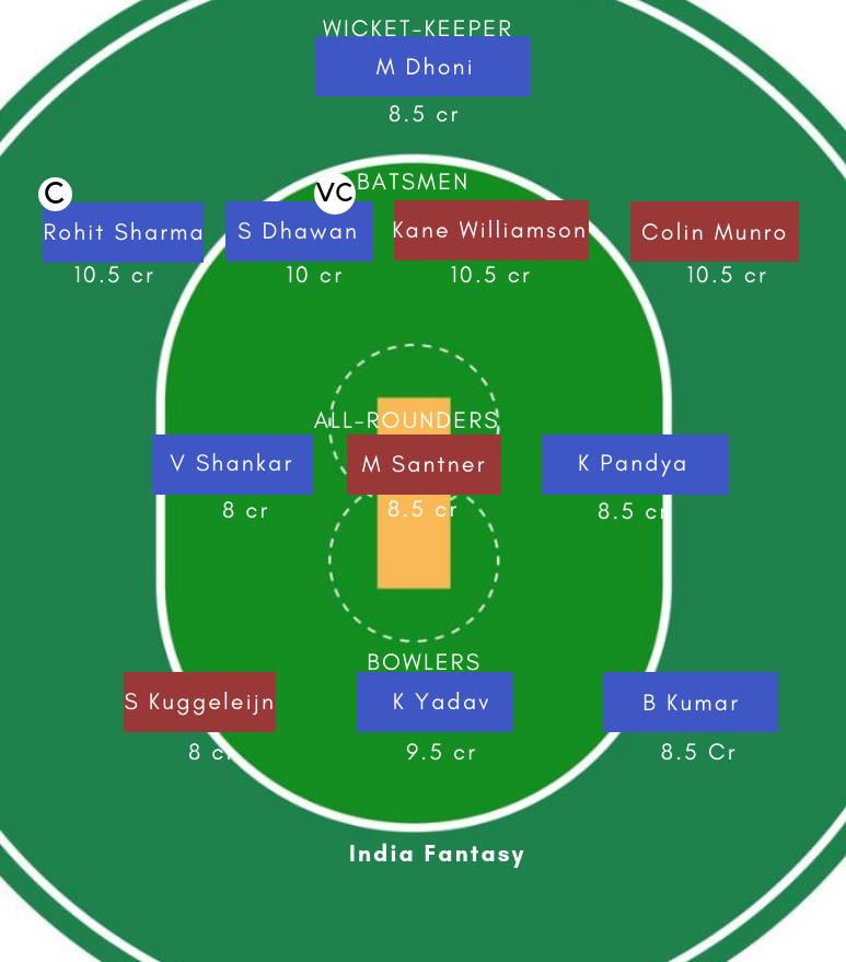 India: Rohit Sharma, Shikhar Dhawan, R Pant, V Shankar, MS Dhoni (wk), Bhuvneshwar Kumar, Hardik Pandya, Krunal Pandya