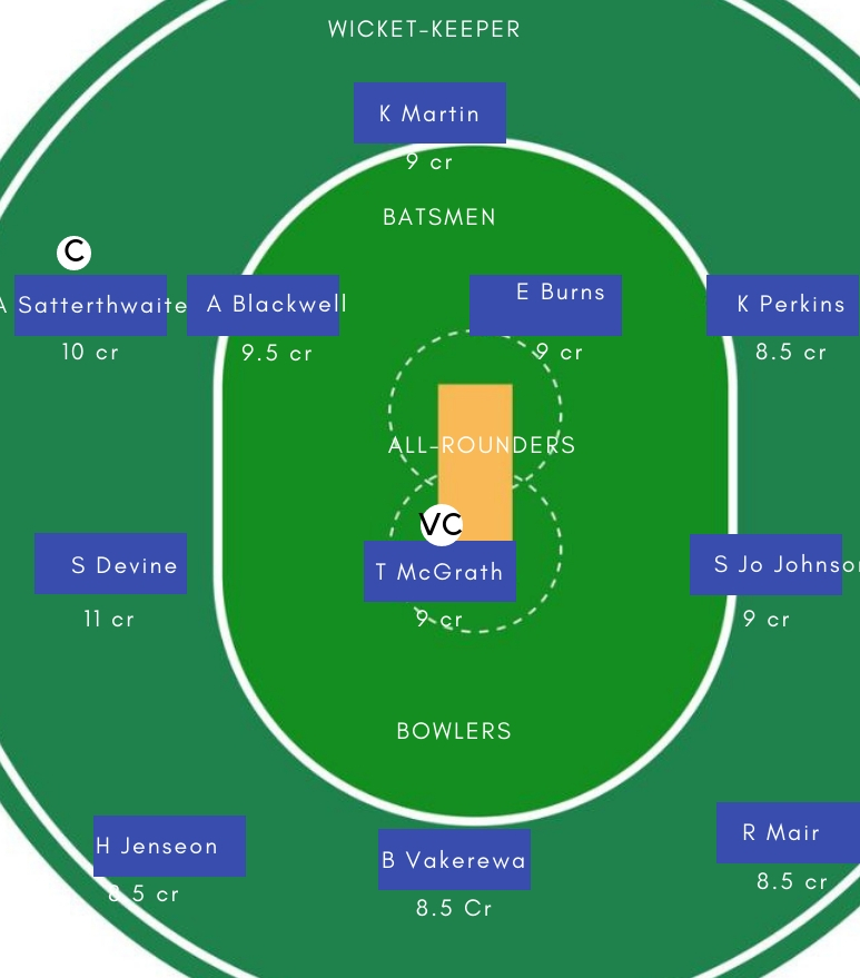 ऑलराउंडर – ऑलराउंडर के तौर पर Amelia Kerr, S Devine, Sammy Jo Johnson सबसे अच्छी विकल्प होगी। Amelia Kerr इस समय बेहद शानदार फॉर्म में मौजूद है, वो गेंद से पहले दोनोे ंही मैचों में कारगर साबित हुई है।