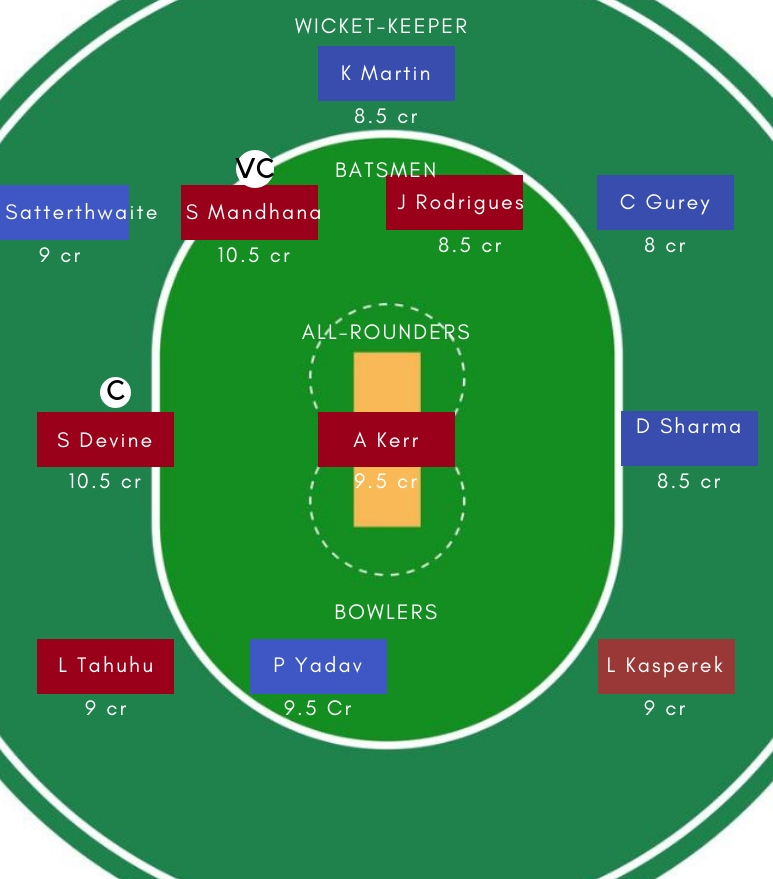 बल्लेबाज – बल्लेबाजी में Smriti Mandhana, Suizes Bates, Amy Satterthwaite, Jemimah Rodrigues, Harmanpreet Kaur सबसे अच्छी विकल्प होगी। Mandhana ने इस वनडे सीरीज के बाद टी20 के पहले मैच में अपना शानदार फॉर्म जारी ऱखा है। वही, Amy Satterthwaite ने पिछले मैच में बढिया बल्लेबाजी की थी।