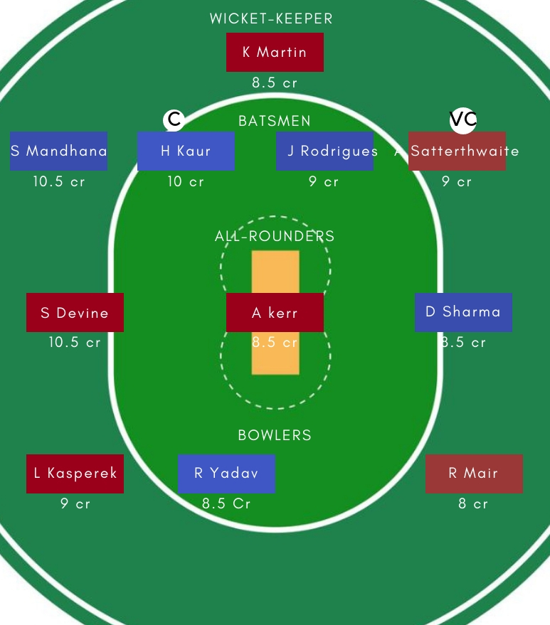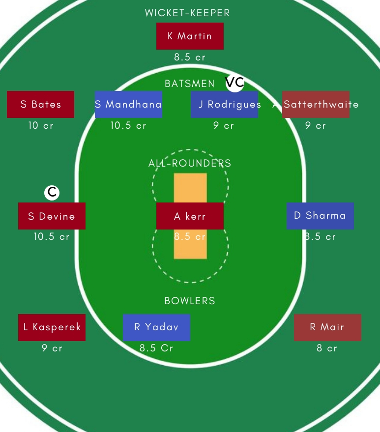 बल्लेबाज – बल्लेबाजी में Suizes Bates, Harmanpreet Kaur, Jemimah Rodrigues, Smriti Mandhana सबसे अच्छी विकल्प होगी। Mandhana ने इस पूरे दौरे पर ढेरों रन बनाए है। वही, Rodrigues ने अपनी बल्लेबाजी से काफी प्रभावित किया है।