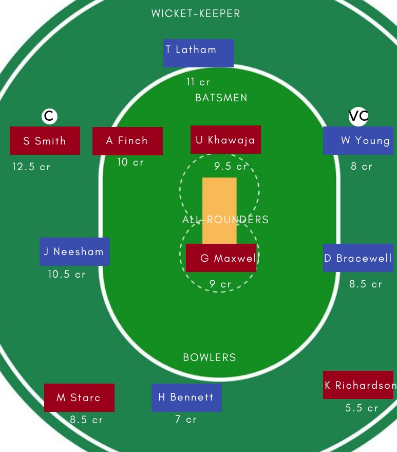बल्लेबाज – बल्लेबाजी में Will Young, G Worker, A Finch, S Smith सबसे अच्छे विकल्प होंगे। Smith ने दूसरे मैच में शानदार बल्लेबाजी करते हुए 77 गेदों में 89 रनों की पारी खेली थी। वही, Will Young ने आखिरी मैच मे 130 रन बनाए थे। जबकि Young ने पहले मैच मे भी 60 रन बनाए थे।