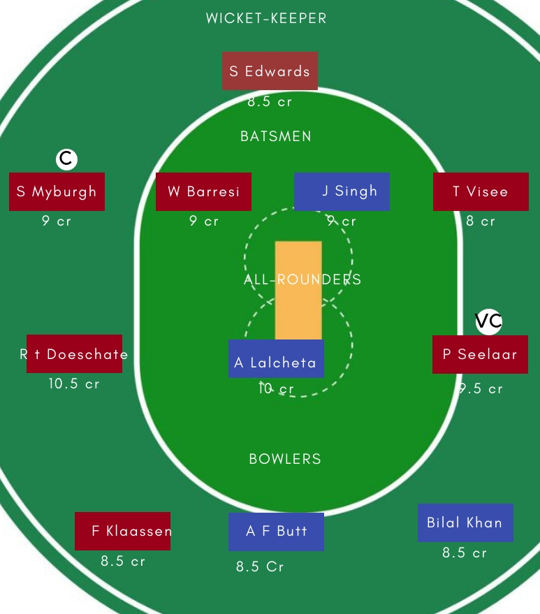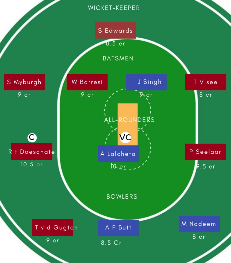 बल्लेबाज – बल्लेबाजी में Jatinder Singh,Stephan Myburgh, Wesley Barresi, Tobia Visee सबसे अच्छे विकल्प होगें। Tobia Visee ने पिछले मैच में शानदार अर्धशतकीय पारी खेली थी। वही, Jatinder Singh पिछले मैच में रंग में नजर आए थें।