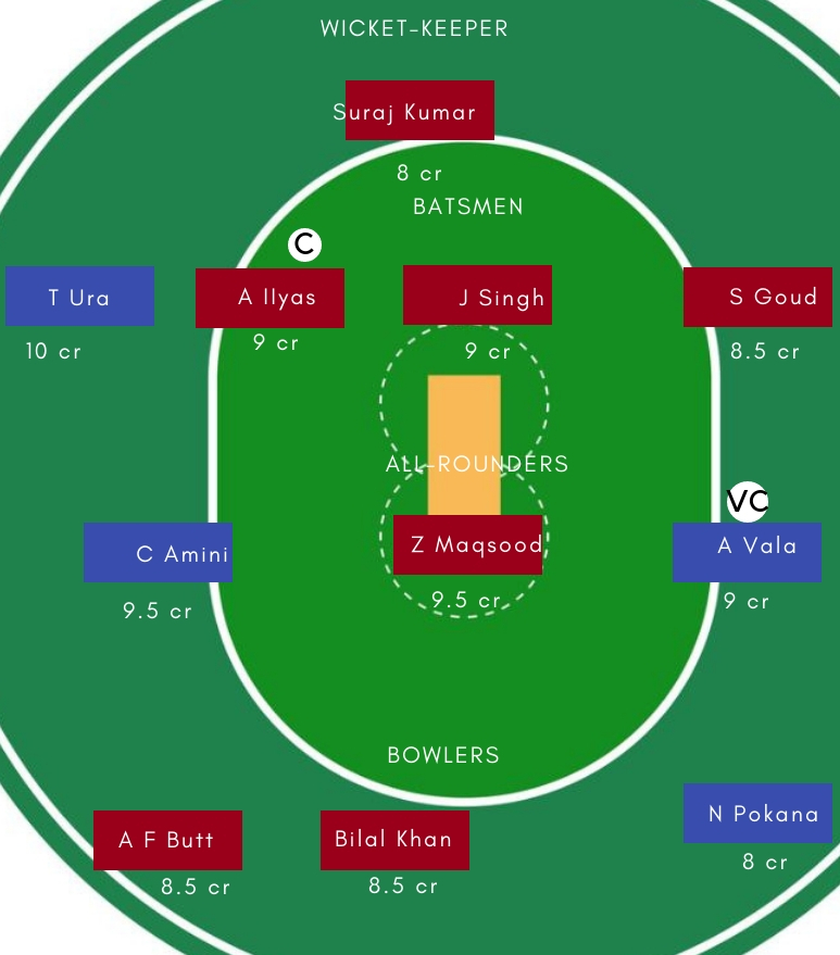 ऑलराउंडर – ऑलराउंडर के तौर पर A Vala, C Amini, Khawar Ali, Zeeshan Maqsoos सबसे अच्छे विकल्प होगे। A Vala ने पिछले मैच में शानदार 82 रनों की पारी खेली थी। जबकि Khawar Ali ने आखिरी मैच में बढिया गेंदबाजी की है।