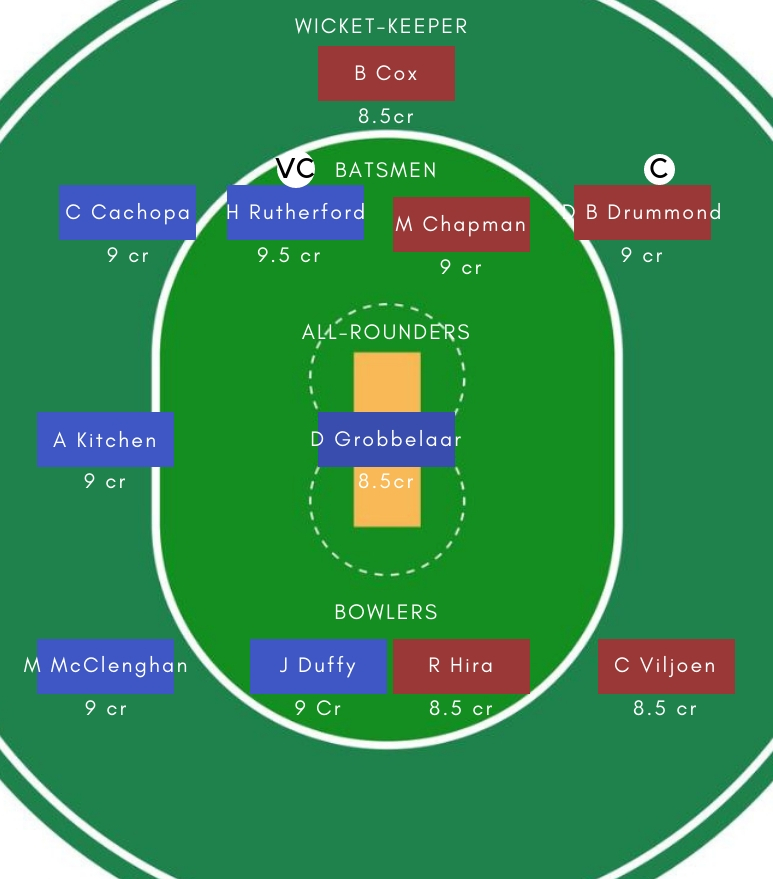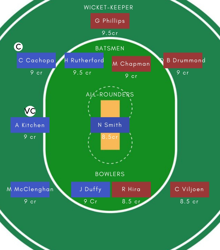 गेंदबाज – गेंदबाजी में Jacob Duffy, Mitchell McClenghan, Roneel Hira Christi Viljoen सबसे अच्छे ऑप्शन होगें। McClenghan ने पिछले कुछ मैचों में बेहद शानदार गेंदबाजी की है। पिछले मैच में भी उनके नाम तीन विकेट थें। वही, Christi Vijoen इस समय शानदार लय में मौजूद है।