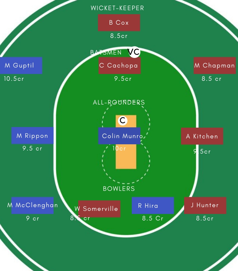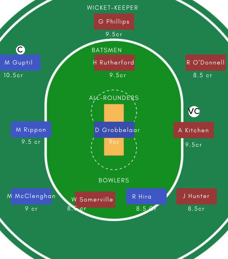 गेंदबाज – गेंदबाजी में Jacob Duffy, Mitchell McClenghan, Will Somerville सबसे अच्छे विकल्प होगें। McClenghan ने वापसी के बाद से शानदार गेंदबाजी का प्रदर्शन किया है। पिछले मैच में भी उन्होने तीन विकेट चटकाए थें।