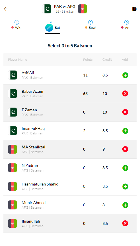 Babar Azam and Fakhar Zaman will be the two safe bet from Pakistan while Ihsanullah and Asghar Stanikzai will be the right choices from Afghanistan.