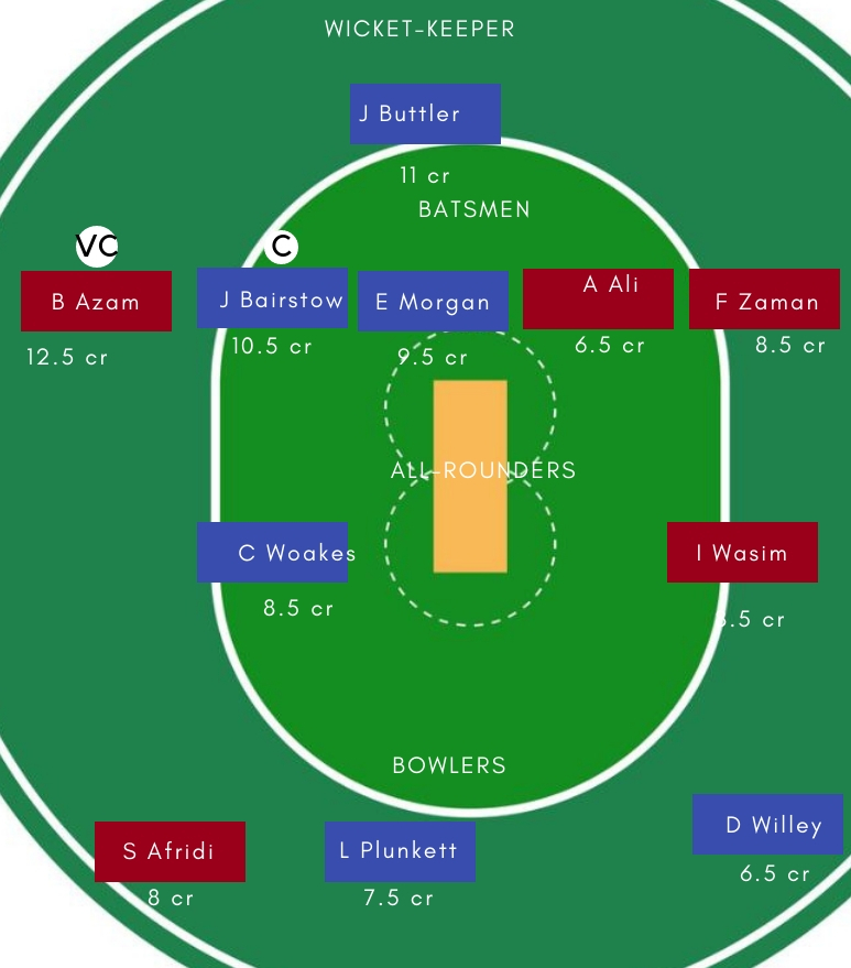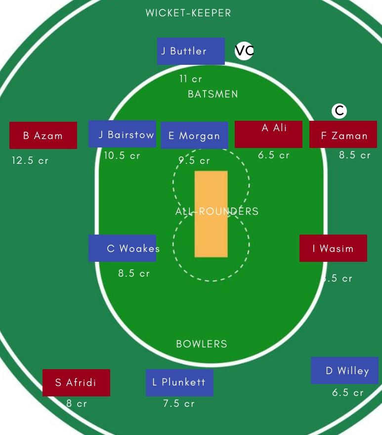 ऑलराउंडर – ऑलराउंडर के तौर पर Chris Woakes, I Wasim सबसे अच्छे विकल्प होंगे। Wasim ने पिछले 5 वनडे मैचों में कुल 121 रन बनाए है, साथ ही 3 विकेट भी चटकाए है। पैक्टिस मैच में Wasim ने शानदार शतक जड़ा था।