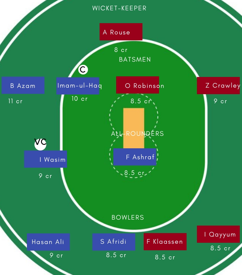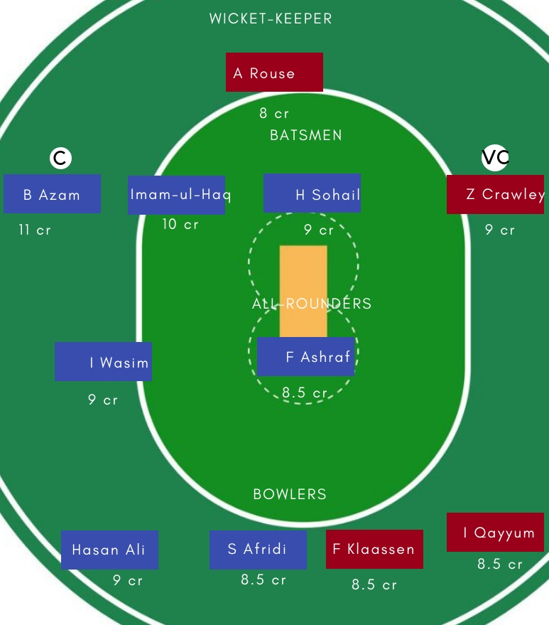 बल्लेबाज – बल्लेबाजी में Zak Crawley, Alex Blake, Babar Azam, Fakhar Zaman, Imam-ul-Haq सबसे अच्छे विकल्प होंगे। Zak Crawley इस समय बेहद शानदार फॉर्म में मौजूद है। जबकि Babar Azam इस मैच में बड़ी पारी खेल सकते है।