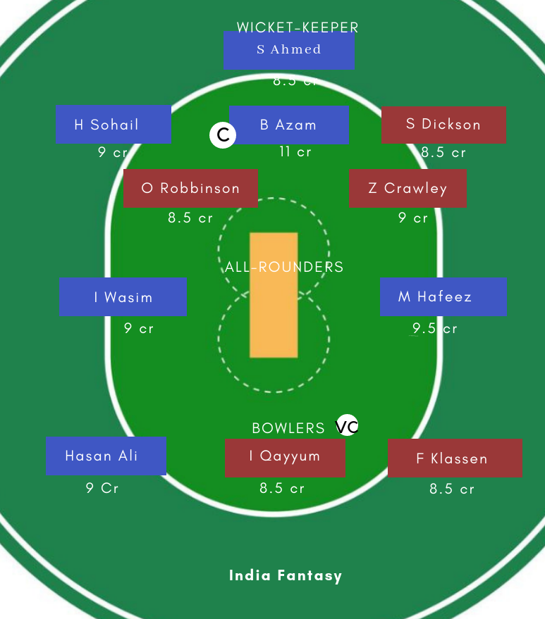 In bowlers, F Klassen, I Qayyum, Hasan Ali and S Shah Afridi will be the best. M Amir hasn’t been in the wickets for quite a long period of time.