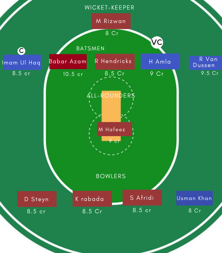 बल्लेबाज : Babar Azam , Fakhar Zaman, Shoaib Malik , Imam ul Haq