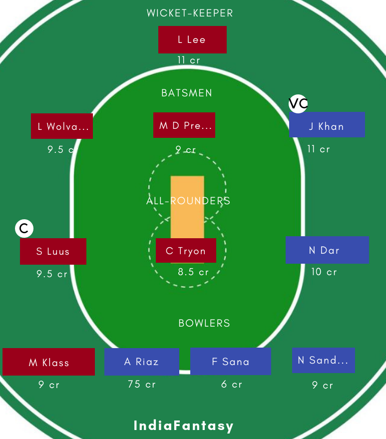 South Africa Women – Mignon du Preez, Marizanne Kapp, Shabnim Ismail, Chloe Tryon, Sune Luus (c), Lizelle Lee (wk), Andrie Steyn, Masabata Klaas, Laura Wolvaardt, Sinalo Jafta, Tumi Sekhukhune