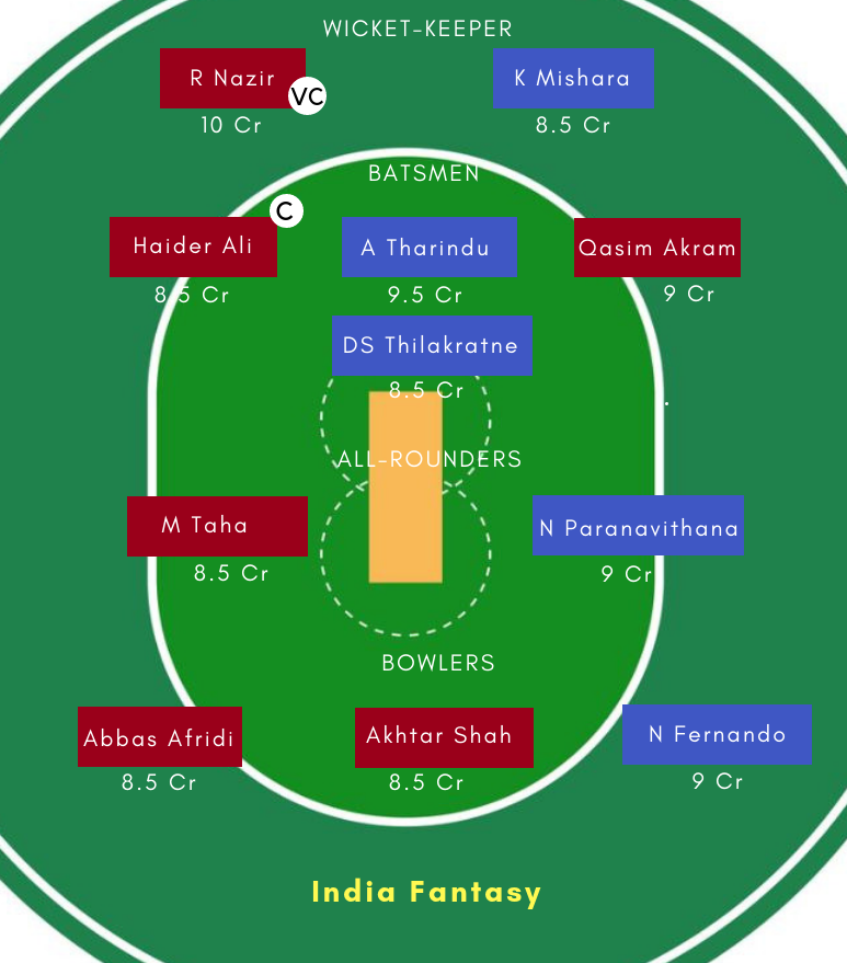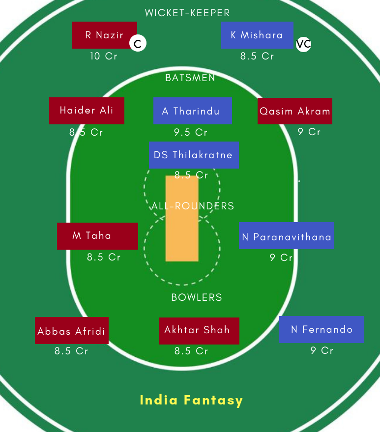 Batsmen: Avishka Tharindu, Ravindu Rasantha, Thaveesha Kahaduwaarachchi, Kamil Mishra (c), Chamindu Kushan