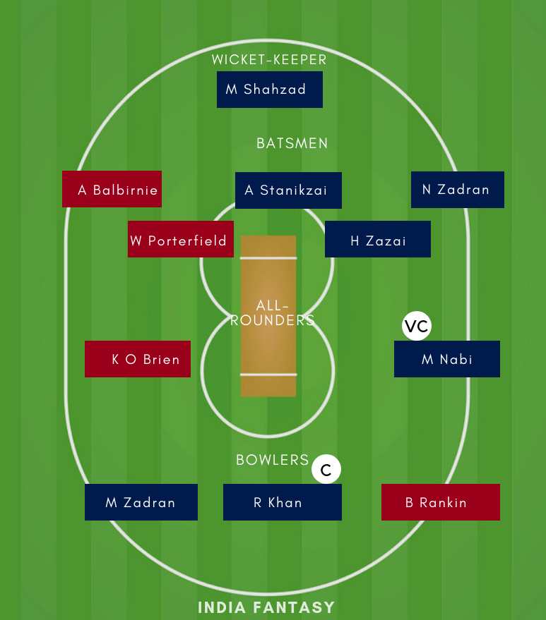 Hazratullah Zazai, Asgar Afghan (C), Mohammad Shahzad(WK), Rahmat Shah, Mujeeb Ur Rahman, Hashmatullah Shahidi, Gulbadin Naib, Mohammad Nabi, Najibullah Zadran, Rashid Khan, Aftab Alam