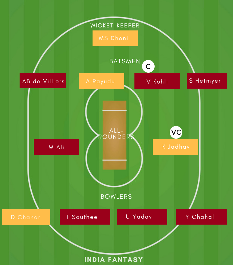 Moeen Ali, Parthiv Patel, Virat Kohli, AB de Villiers, Shimron Hetmyer, Shivam Dube, Pawan Negi, Tim Southee, Umesh Yadav, Mohammed Siraj, Yuzvendra Chahal