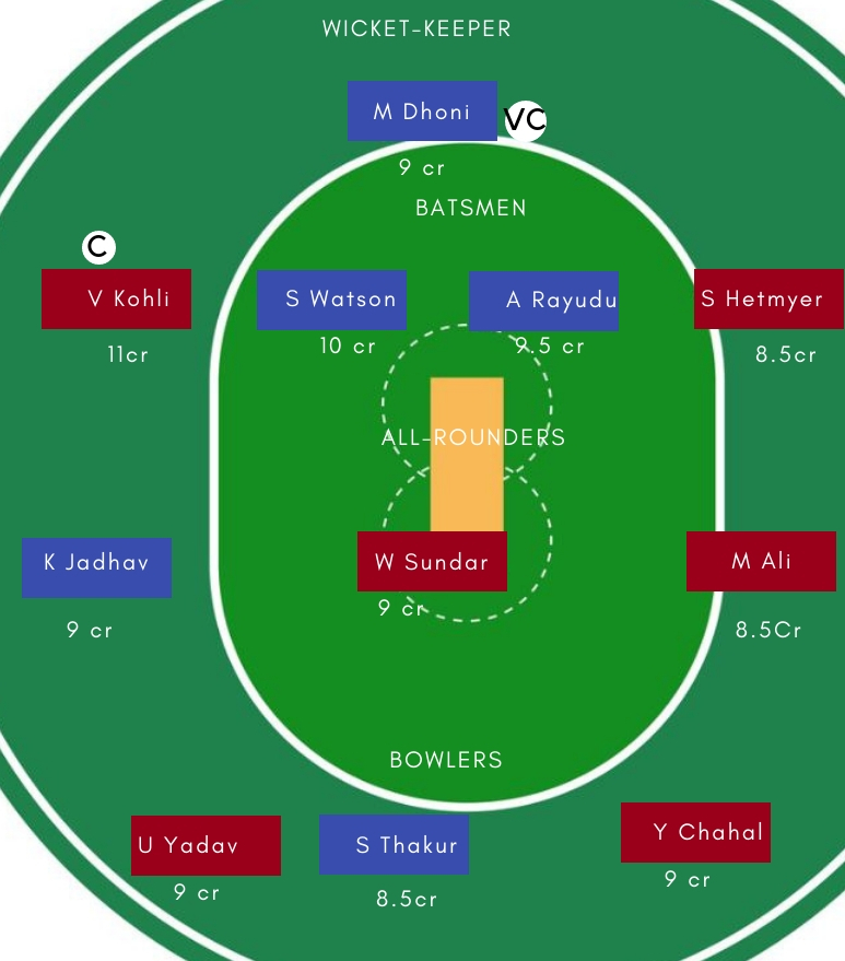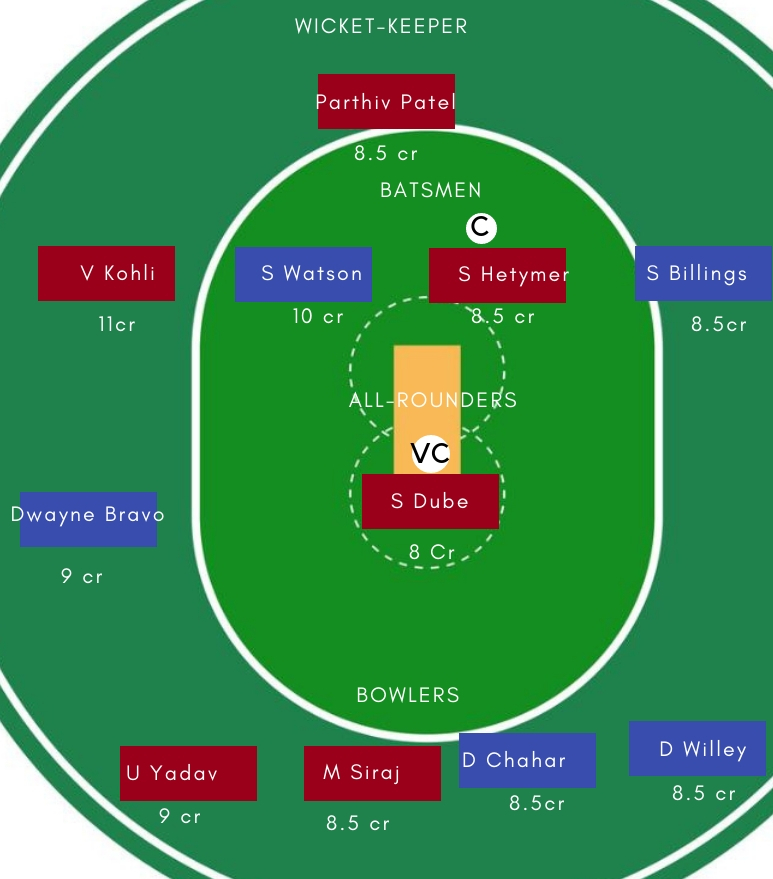 बल्लेबाज – बल्लेेबाजी में Virat Kohli, Shimron Hetmyer, Suresh Raina, Faf du Plessis सबसे अच्छे विकल्प होगें। Virat Kohli इस समय बेहद शानदार फॉर्म में नजर आए है। जबकि Suresh Raina के नाम आईपीएल में सबसे ज्यादा रन है।