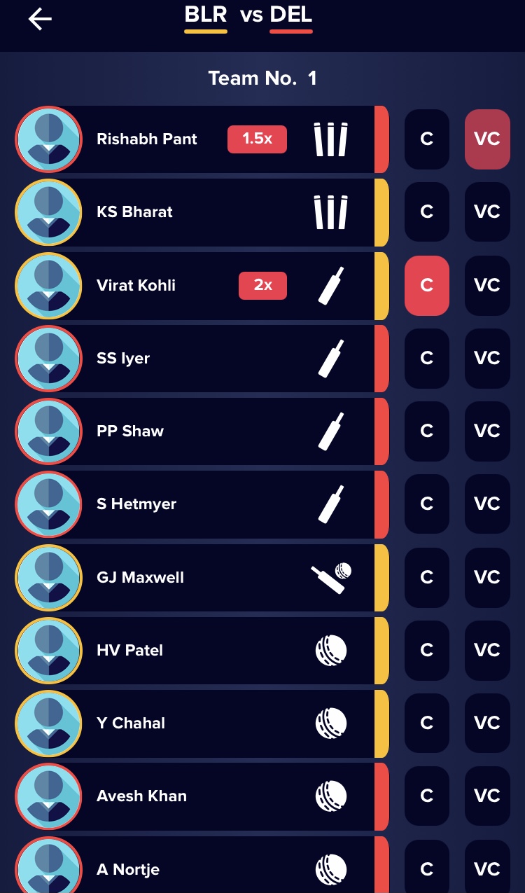 WICKET-KEEPERS: Rishabh Pant, KS Bharat BATSMEN: Virat Kohli, Shreyas Iyer, Prithvi Shaw, Shimron Hetmyer ALL-ROUNDERS: Glenn Maxwell BOWLERS: Avesh Khan, Anrich Nortje, Harshal Patel, Yuzvendra Chahal