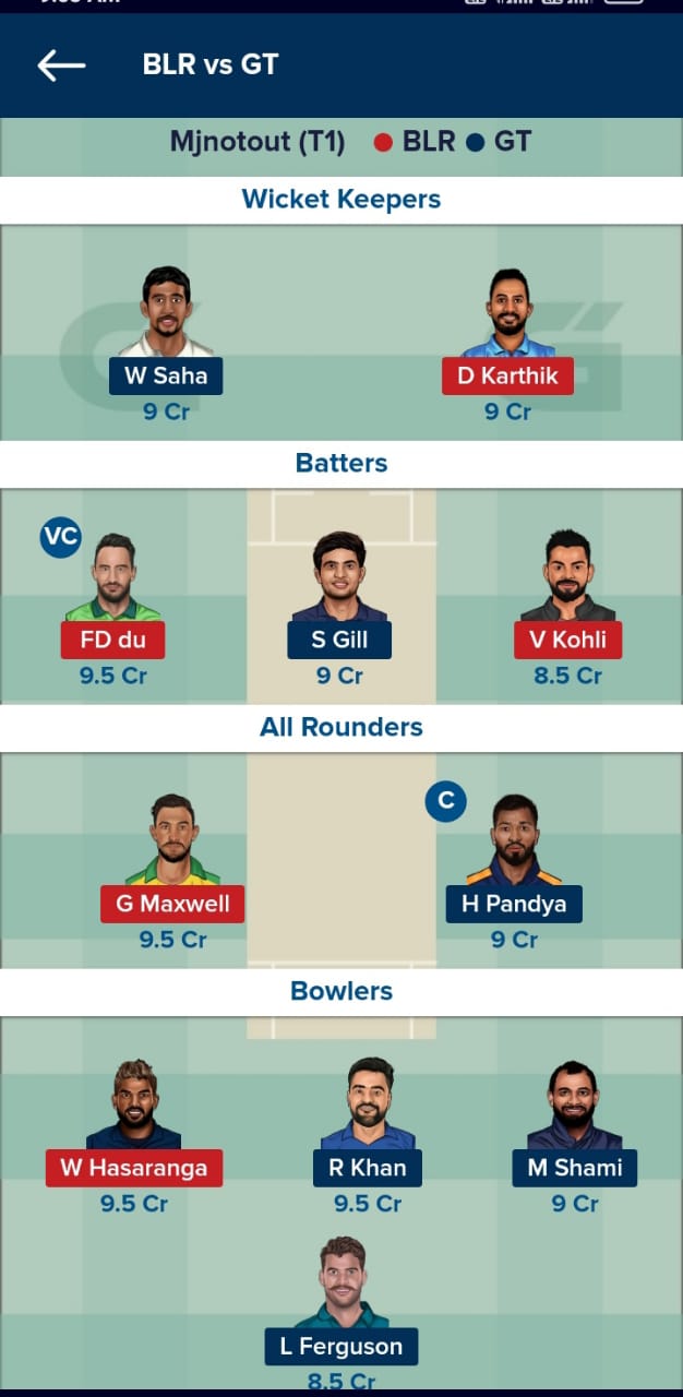 WICKET-KEEPERS: Wriddhiman Saha, Dinesh Karthik BATSMEN: Faf du Plessis, Shubman Gill, Virat Kohli ALL-ROUNDERS: Hardik Pandya, Glenn Maxwell BOWLERS: Rashid Khan, Wanindu Hasaranga, Lockie Ferguson, Mohammad Shami