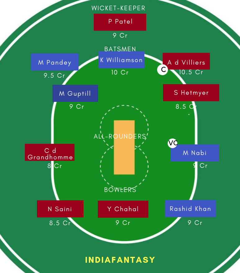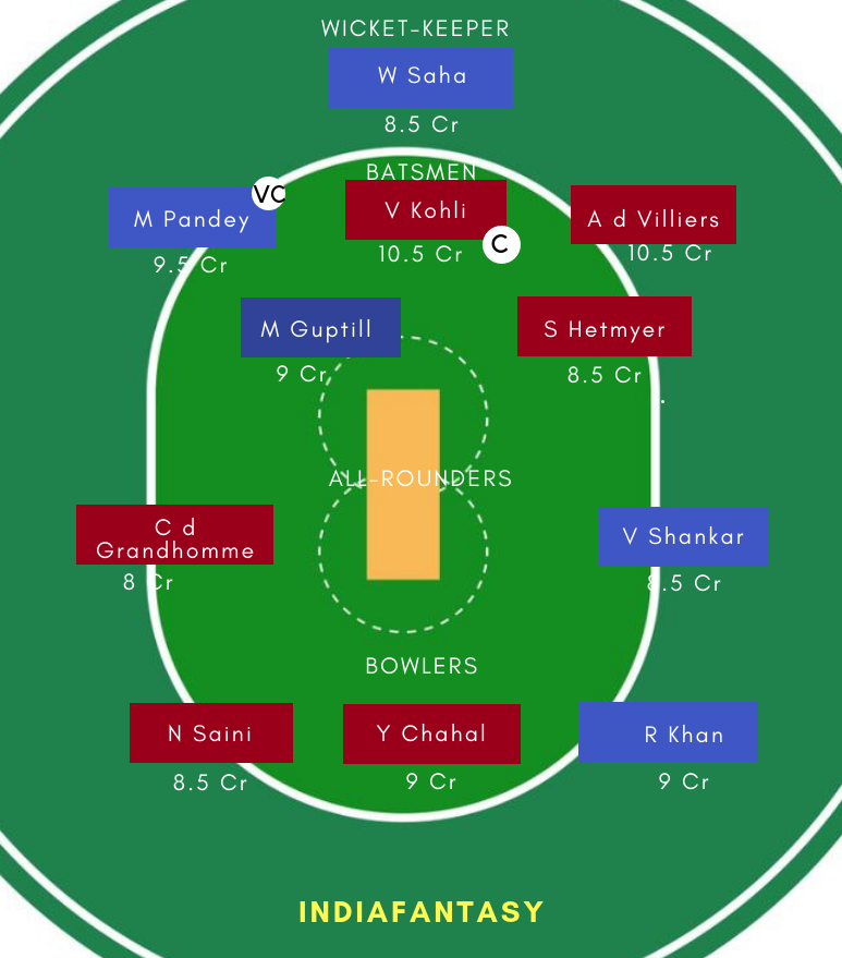 RCB: Parthiv Patel (WK), Virat Kohli (C), AB De Villiers, Colin de Grandhomme, Heinrich Klassen, Shivam Dube, Gurkeerat Singh Mann, Wahington Sundar, Umesh Yadav, Yuzvendra Chahal, Navdeep Saini, Umesh Yadav