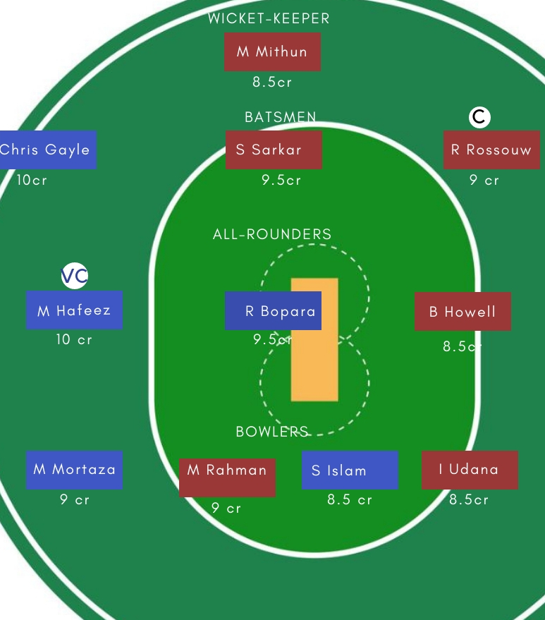 R Rossouw, Mohammad Mithun, ने पिछले मैच में शानदार बल्लेबाजी का प्रदर्शन किया था। वही गेंदबाजी में Shafiul Islam, Howell ने किफायती गेंदबाजी के साथ अहम विकेट अपने नाम किए थे। हालांकि Nazmul Islam ने अपने महज 2 ओवर में 24 रन लुटाए थे।