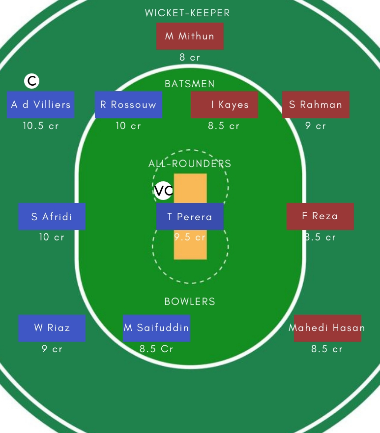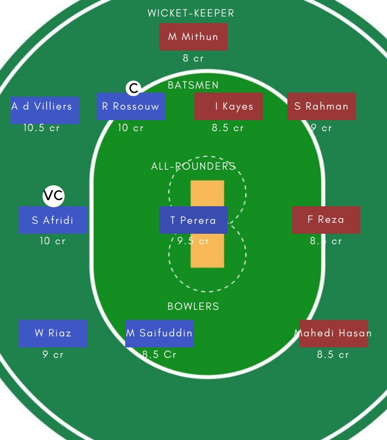 बल्लेबाज : Chris Gayle, Ab de Villiers ,Rilee Rossouw, (Doubt: Mehedi Maruf)