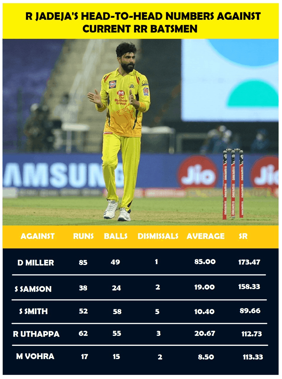Jadeja’s H2H numbers against the current RR batsman makes for good reading. Apart from Miller and Samson to an extent, everyone else struggles against the CSK all-rounder. With Miller most possibly coming late down the order and the wrist-spin threat looming him, Jadeja has the chance to add some numbers to his wicket-tally.