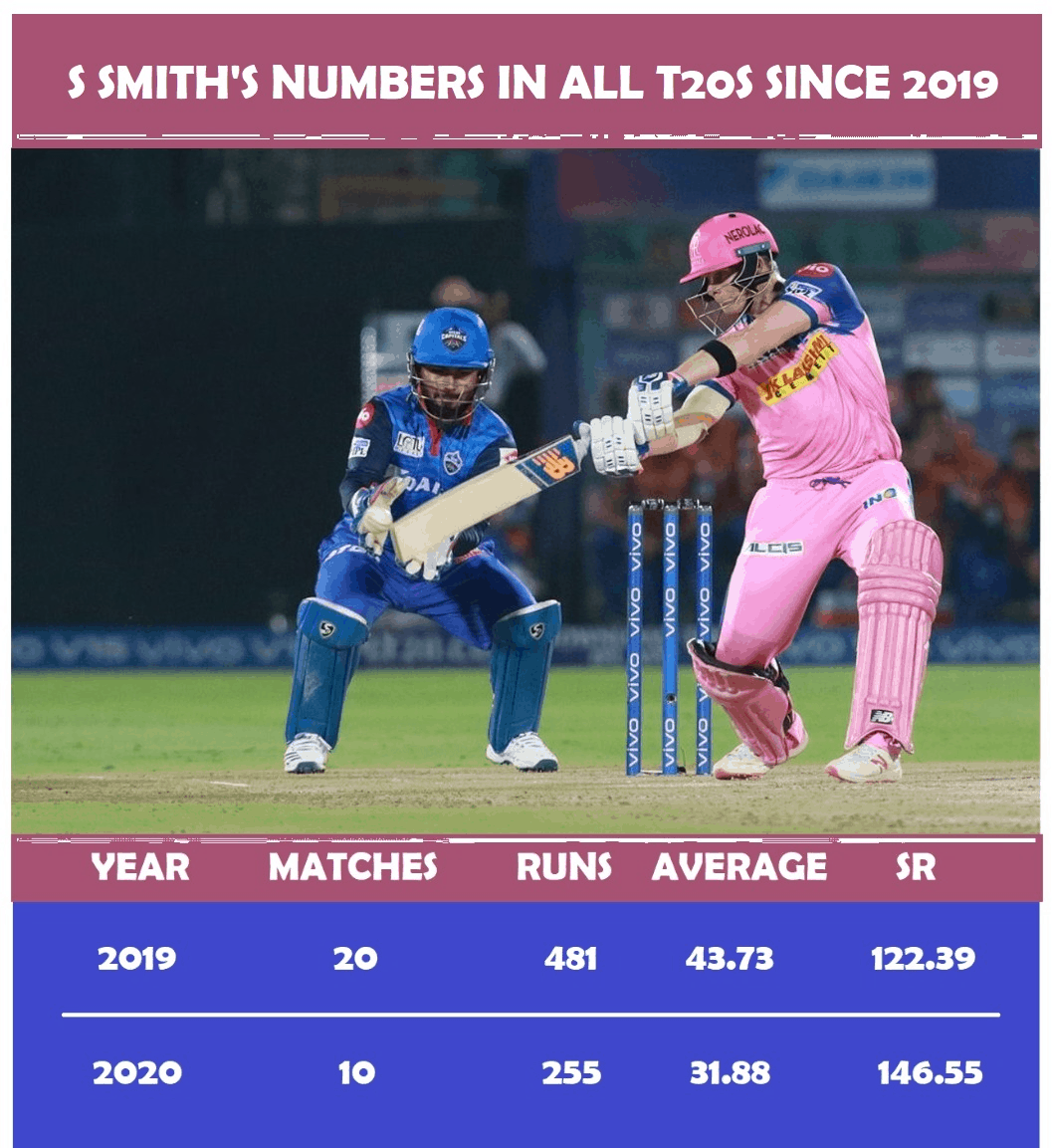 After the sandpaper controversy in 2018, S Smith returned to play for Rajasthan Royals in IPL 2019 but endured a bad run of form mostly struggling for rhythm. But ever since that Ashes series in 2019, he has been in terrific form in all forms of the game and if we go by his T20 numbers in 2020, we’re in for a great treat.
