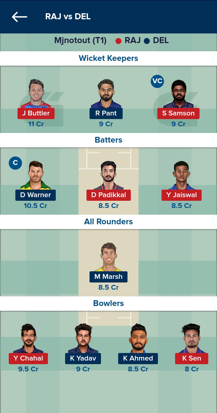 WICKET-KEEPERS: Jos Buttler, Sanju Samson, Rishabh Pant BATSMEN: David Warner, Devdutt Padikkal, Yashasvi Jaiswal ALL-ROUNDERS: Mitchell Marsh BOWLERS: Yuzvendra Chahal, Kuldeep Yadav, Kuldeep Sen, Khaleel Ahmad