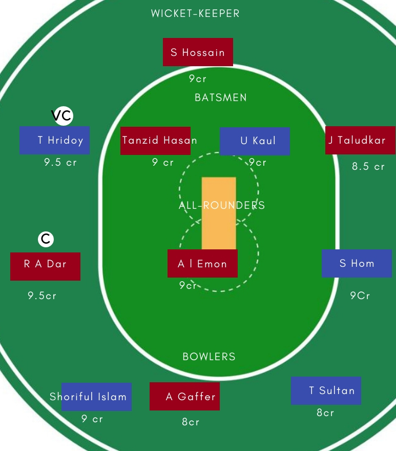 गेंदबाज – गेंदबाजी में Shoriful Islam, Tipu Sultan, Abdul Gaffar सबसे अच्छे विकल्प होगें। Shoriful Islam ने पिछले मैच में तीन विकेट अपने नाम किए थें। जबकि Gaffar ने भी टूर्नामेंट में अच्छी गेंदबाजी की है।