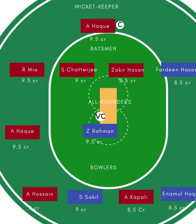 गेंदबाज – गेंदबाजी में Salaudin Sakil, Al-Amin Hossain, M Enamul Haque सबसे अच्छे विकल्प होगें। Sakil ने पिछले मैच में शानदार गेंदबाजी की थी।
