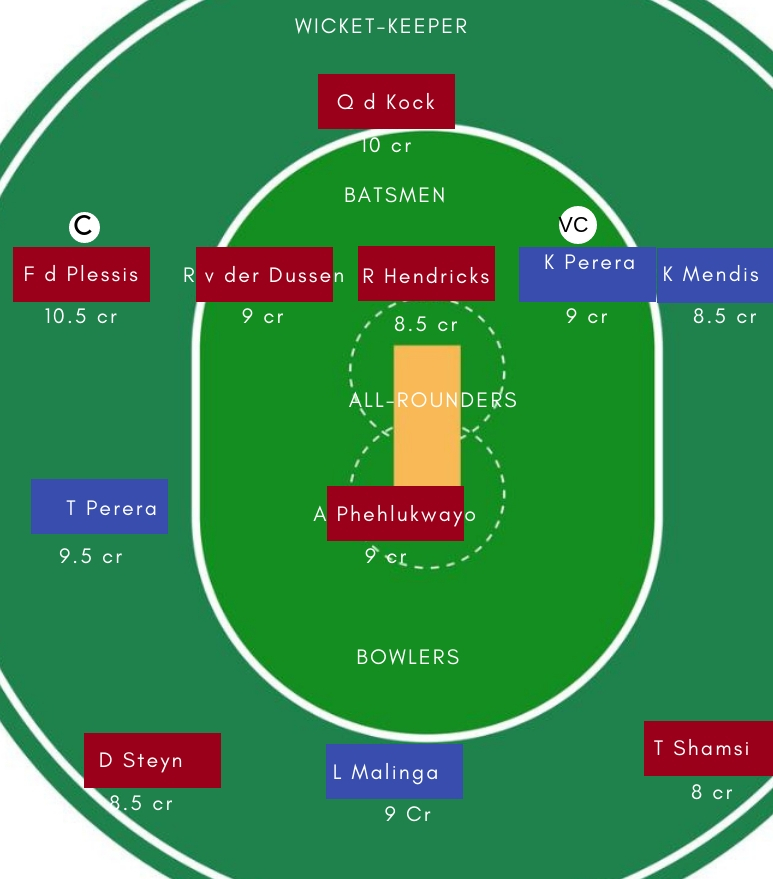 बल्लेबाज – बल्लेबाजी में Faf de Plessis, Reeza Hendricks, Kusal Mendis, Upul Tharanga सबसे अच्छे विकल्प होगें। Faf du Plessis ने टेस्ट सीरीज में भी शानदार बल्लेबाजी का प्रदर्शन किया था। जबकि Kusal Mendis ने दूसरे टेस्ट मैच में शानदार बल्लेबाजी की थी।