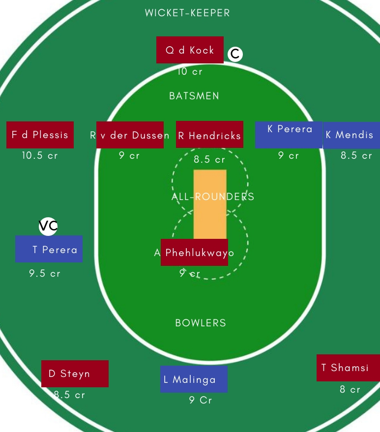 ऑलराउंडर – ऑलराउंडर के तौर पर Andile Phehlukwayo, Thisara Perera सबसे अच्छे विकल्प होगें। दोनों ही खिलाड़ी बल्ले और गेंद दोनो ंसे अहम योगदान देने में सक्षम है।