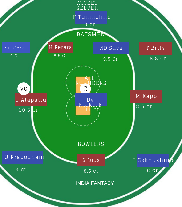 बल्लेबाज : H Perera श्रीलंका की बेहतरीन बल्लेबाजों में से एक हैं. ND Silva/I Mendis में से किसी एक को टीम में शामिल करें. मेजबान टीम की ओर से T brits और L Goodall बेहतरीन ऑप्शन हैं.