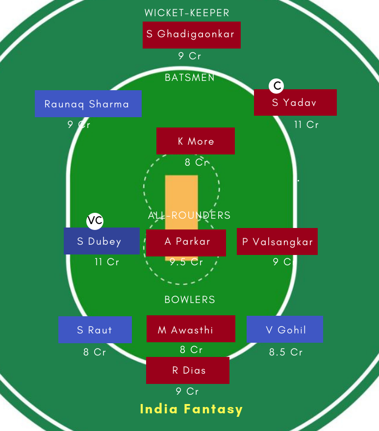 Siddhesh Lad (c), Shivam Dube, Vijay Gohil, Shivam Malhotra, Tanush Kotian, Rudra Dhanday, Swapnil Pradhan, Hardik Tamore (wk), Sachin Yadav, Raunaq Sharma, Siddharth Raut