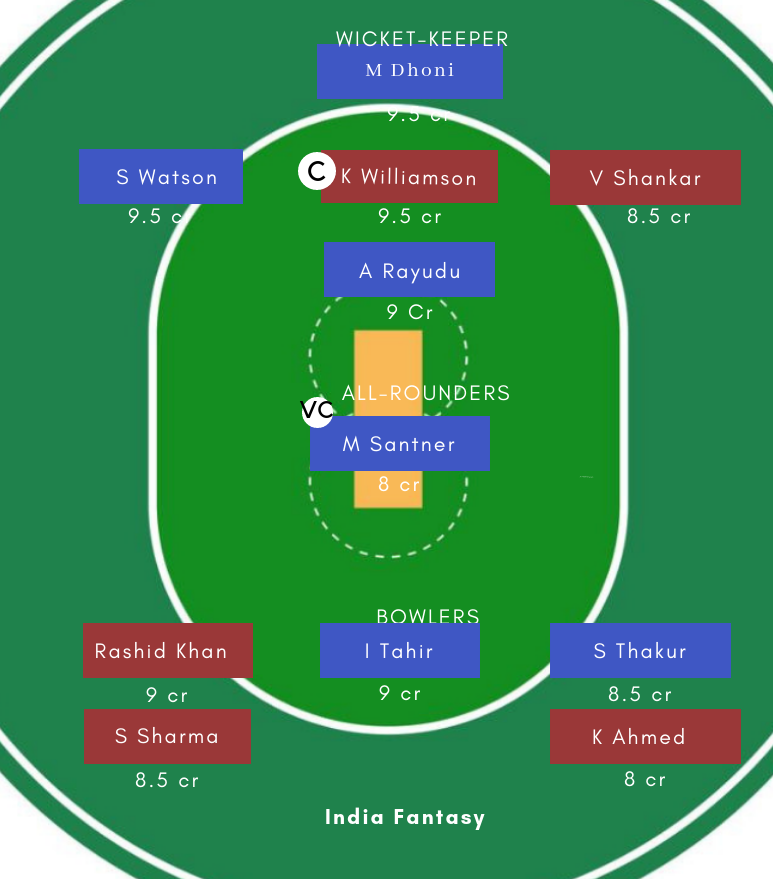 Faf du Plessis, Shane Watson, Ambati Rayudu, Shardul Thakur, Suresh Raina, Ravindra Jadeja, Kedar Jadhav, Imran Tahir, Deepak Chahar, Karn Sharma