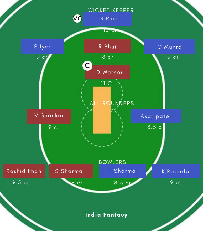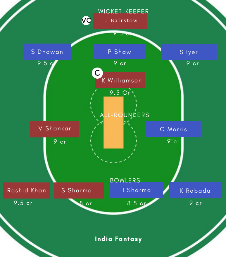 In bowlers, K Rabada is the best pick from Delhi while M Nabi, Rashid Khan, Bhuvaneshwar Kumar and Sandeep Sharma form the formidable bowling line up for SRH.