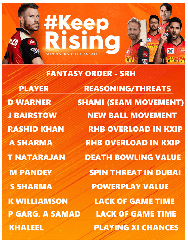 Possible SRH Dream11 Playing 11 – D Warner (C) J Bairstow(WK) M Pandey K Williamson P Garg A Samad A Sharma R Khan S Sharma T Natarajan K Ahmad