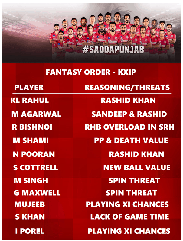 Rashid Khan – The Afghan leggie is back to his belligerent best with 3 extra-ordinary bowling spells in the last three matches. With the lack of a LHB batsman apart from Pooran in the KXIP attack plays right into the hands of him.