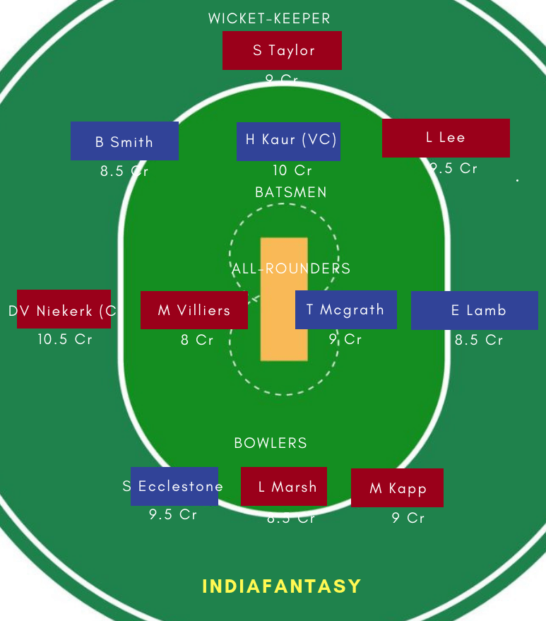 Laura Marsh, Sarah Taylor (wk), Marizanne Kapp, Dane van Niekerk, Natalie Sciver (c), Lizelle Lee, Bryony Smith, Aylish Cranstone, Eva Gray, Mady Villiers, Amy Gordon