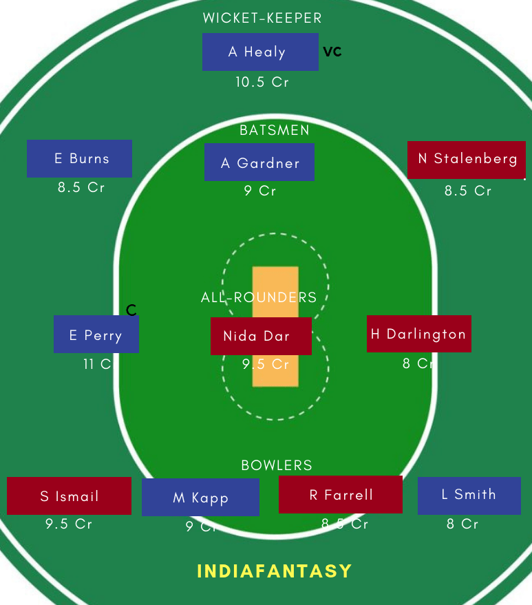 Emma Hughes, Marizanne Kapp, Sarah Aley, Alisha Bates, Erin Burns, Stella Campbell, Maddy Darke, Ashleigh Gardner, Alyssa Healy, Jodie Hicks, Ellyse Perry (c), Hayley Silver-Holmes, Lauren Smith