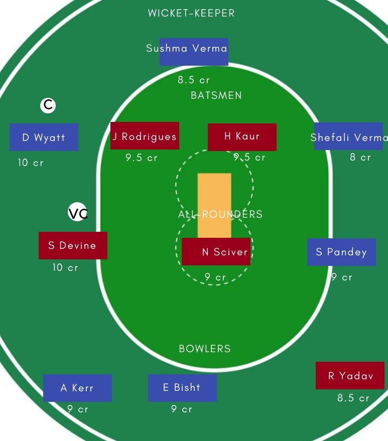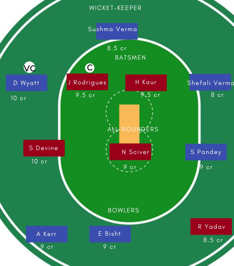 बल्लेबाज – बल्लेबाजी में Daniel Wyatt, M Raj, J Rodrigues, H Kaur सबसे अच्छे विकल्प होंगी। J Rodrigues ने पिछले मैच में शानदार बल्लेबाजी करते हुए महज 48 गेंदों में 77 रनों की नाबाद पारी खेली थी। Rodrigues ने अपनी आखिरी पांच टी20 पारियों में कुल 116 रन बनाए है। Daniel Wyatt ने पिछले 5 टी20 मैचों में कुल 192 रन बनाए है। जबकि पिछले मैच में भी उन्होने 33 गेंदों में 43 रनों की पारी खेली थी।