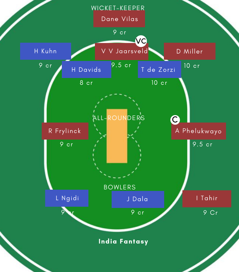 Heino Kuhn (wk), Shaun von Berg, Henry Davids, Heinrich Klaasen (c), Eldred Hawken, Jonathan Vandiar, Farhaan Behardien, Chris Morris, Lungi Ngidi, Tabraiz Shamsi, Junior Dala, Tshepo Moreki, Grant Thomson, Tony de Zorzi
