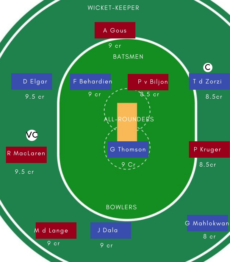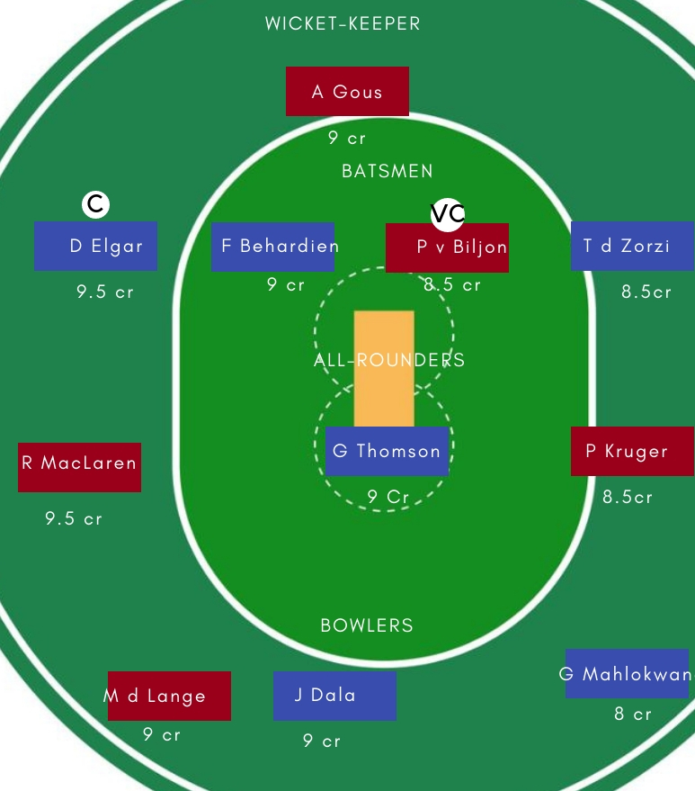 बल्लेबाज – बल्लेबाजी में Farhaan Behardien, Dean Elgar, Tony de Zorzi, Rudi Second, Petrus van Biljon सबसे अच्छी चॉइंस होगें। Dean Elgar ने इस सीजन अच्छी बल्लेबाजी की है। वही, Petrus van Biljon ने भी बल्ले से अहम योगदान दिया है।