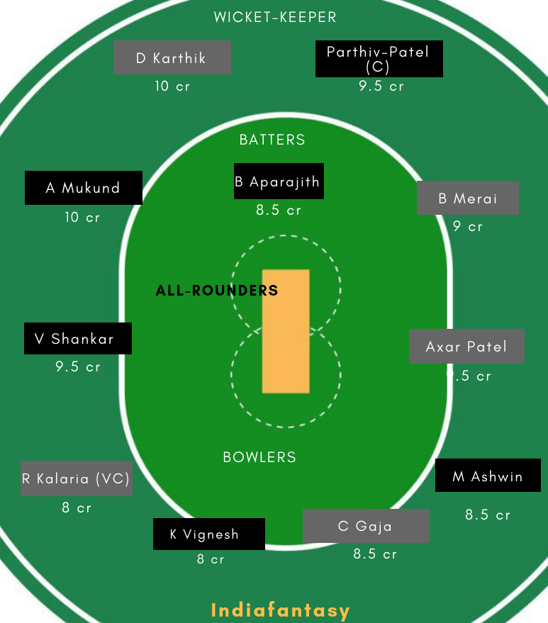 Tamil Nadu- A Mukund, M VIjay, B Aparjith, V Shankar, D Karthik (C), M Sharukh Khan, W Sundar, M Mohammed, K Vignesh, T Natrajan, M Ashwin