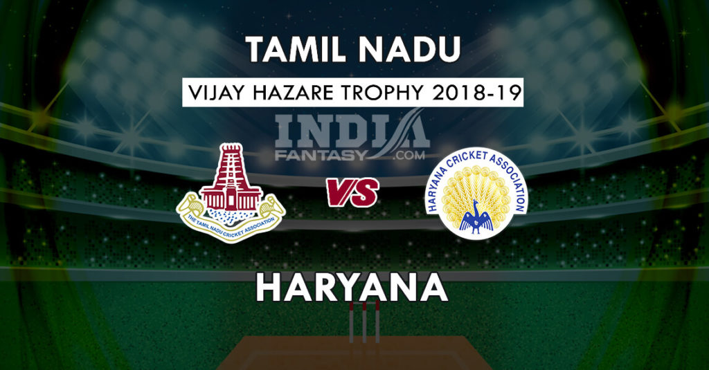 एलीट ग्रुप C के पॉइंट टेबल में पहले स्थान पर चल रही Haryana की टीम विजय हज़ारे ट्रॉफ़ी 2018 के अपने अगले मैच में Tamil Nadu के खिलाफ मुकाबले के लिए उतरेगी। इन दोनो के बीच यह मुकाबला इनके लीग स्तर का अंतिम मुकाबला होगा जो की मंगलवार, 09 अक्टूबर को IIT Chemplast ग्राउंड पर खेला जाएगा।