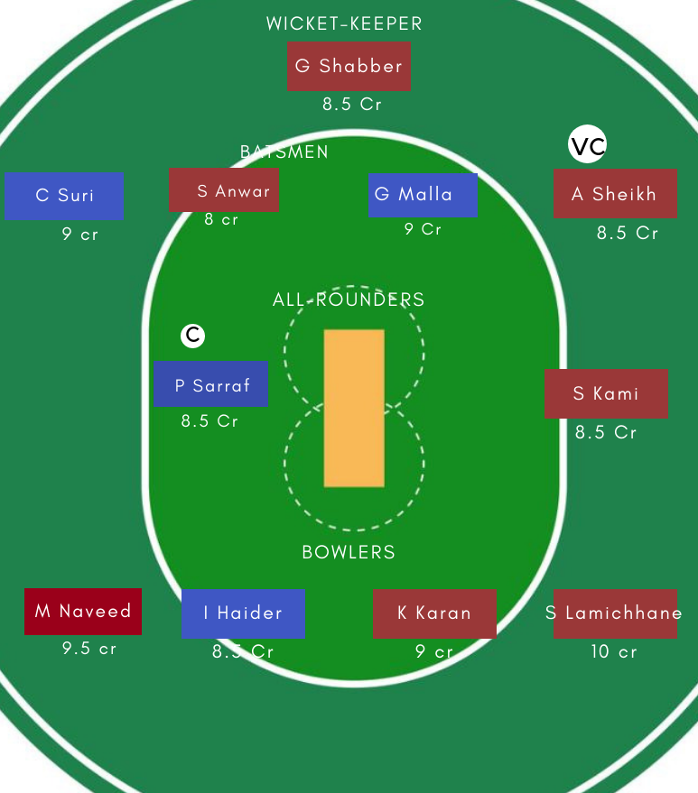 बल्लेबाज : C Suri और S Anwar यूएई की तरफ से परफेक्ट बल्लेबाज हैं. G malla पहले मैच में फ्लॉप रहे. लेकिन, नेपाल के वह सबसे तगड़े बल्लेबाज हैं. A Sheikh को लिया जा सकता है.