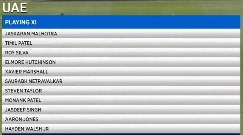 Saurabh Netravalkar (c), Nosthush Kenjige, Timil Patel, Muhammad Ali Khan, Jasdeep Singh, Aaron Jones, Roy Silva, Monank Patel, Hayden Walsh Jr, Jaskaran Malhotra, Xavier Marshall, Jan Nisar Khan, Steven Taylor, Elmore Hutchinson