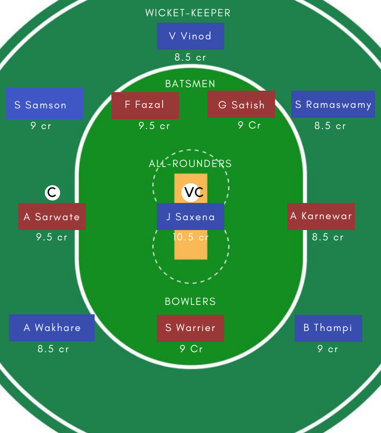 बल्लेबाज : Sachin Baby (c), Sanju Samson, Vishnu Vinod, Ponnam Rahul