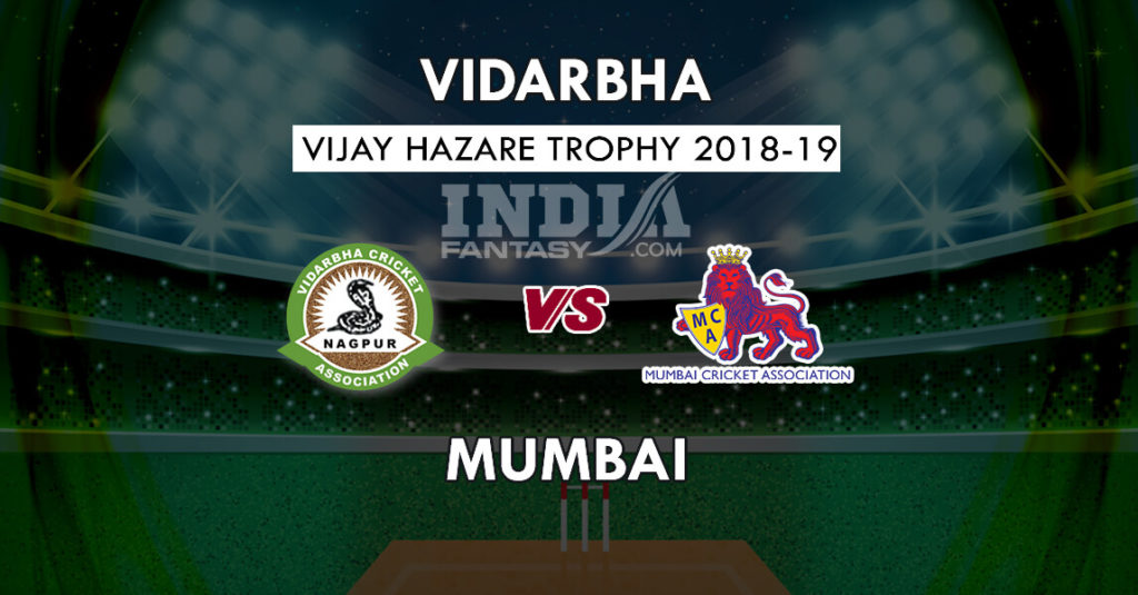 Vidarbha की टीम विजय हज़ारे ट्रॉफी 2018 के अगले मुकाबले में Mumbai के खिलाफ मुकाबले के लिए उतरेगी। इन दोनो के बीच यह मुकाबला सोमवार, 24 सितंबर को KSCA क्रिकेट ग्राउंड Alur में खेला जाएगा।