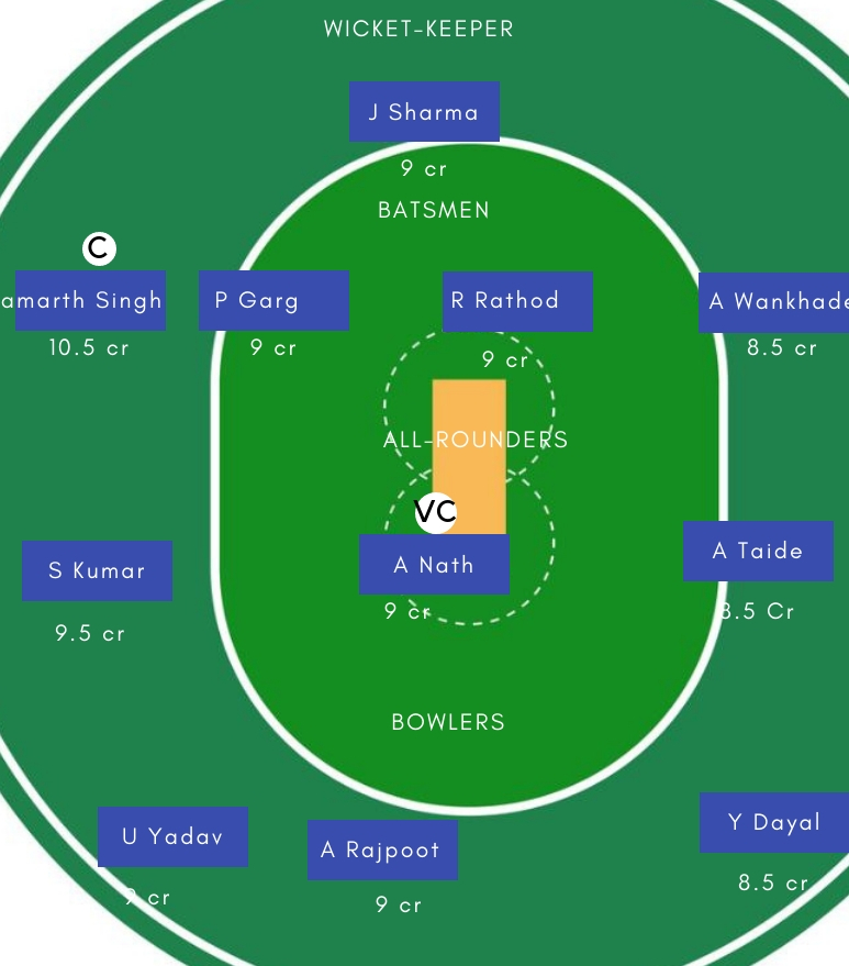 बल्लेबाज – बल्लेबाजी में Shalabh Shrivastava, Apoorv WankhadeSamarth Singh, Priyam Garg, Rinku Singh सबसे अच्छे विकल्प होगें। Samarth Singh ने इस सीजन कुछ अच्छी पारियां खेली है। जबकि Apoorv Wankhade भी बल्ले से अहम योगदान दे सकते है।